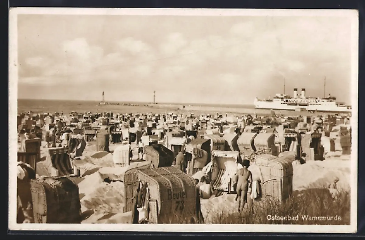 AK Warnemünde, Strand mit Strandkörben und Dampfer
