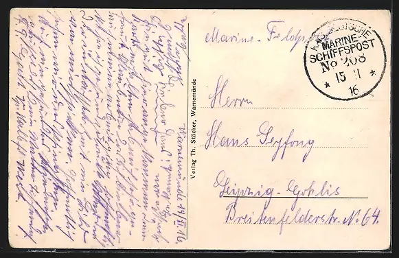 Personenbezogene Daten auf der Rückseite der Karte wurden durch blauen Textmarker unkenntlich gemacht. Die blauen Stellen sind auf die Vorderseite durchgeweicht und wirken sich negativ auf das Postkartenfoto aus