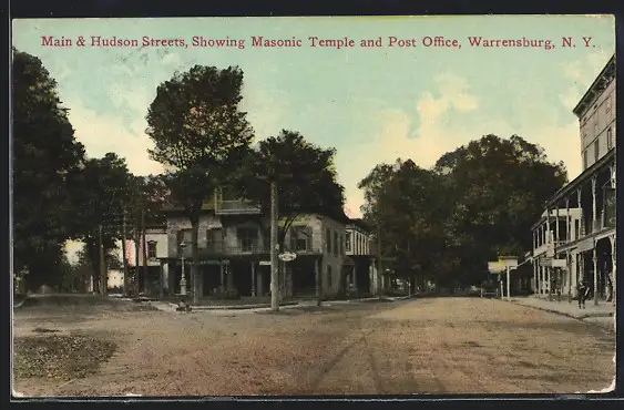 AK Warrensburg, NY, Main & Hudson Streets, Showing Masonic Temple and Post Office