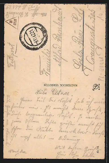 Personenbezogene Daten auf der Rückseite der Karte wurden durch blauen Textmarker unkenntlich gemacht. Die blauen Stellen sind auf die Vorderseite durchgeweicht und wirken sich negativ auf das Postkartenfoto aus