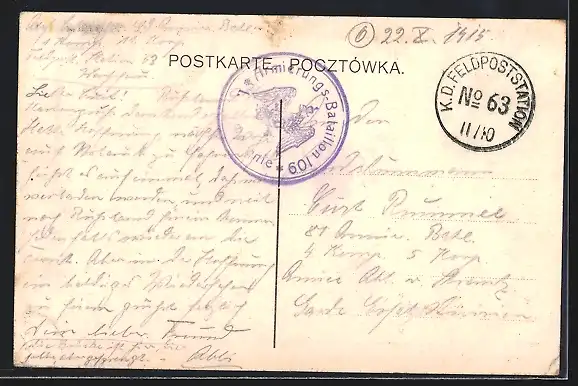 Personenbezogene Daten auf der Rückseite der Karte wurden durch blauen Textmarker unkenntlich gemacht. Die blauen Stellen sind auf die Vorderseite durchgeweicht und wirken sich negativ auf das Postkartenfoto aus