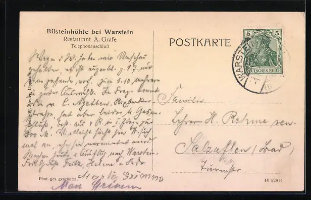 AK Warstein, Restaurant A. Grafe, Tropfsteinpartie in der Bilsteinhöhle, Ortsansicht