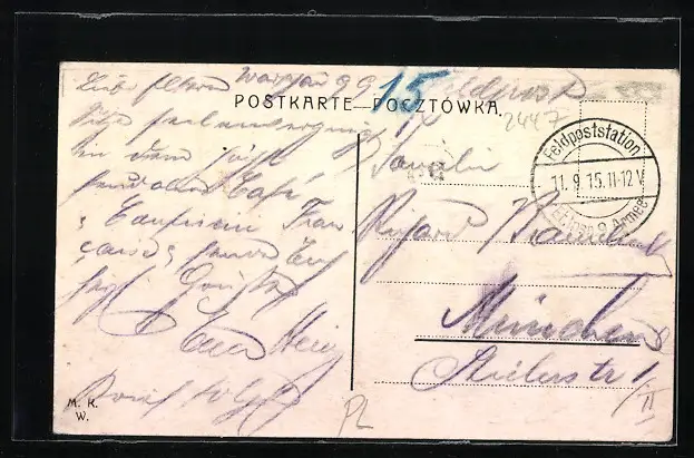 Personenbezogene Daten auf der Rückseite der Karte wurden durch blauen Textmarker unkenntlich gemacht. Die blauen Stellen sind auf die Vorderseite durchgeweicht und wirken sich negativ auf das Postkartenfoto aus