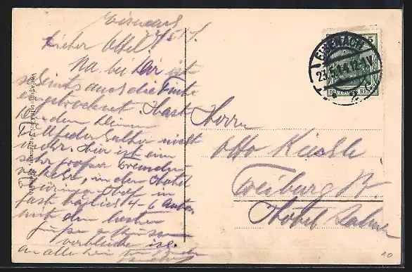 Personenbezogene Daten auf der Rückseite der Karte wurden durch blauen Textmarker unkenntlich gemacht. Die blauen Stellen sind auf die Vorderseite durchgeweicht und wirken sich negativ auf das Postkartenfoto aus