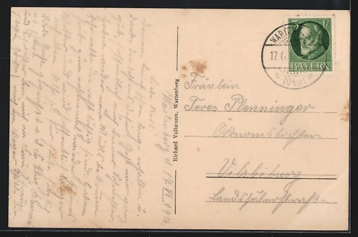 Personenbezogene Daten auf der Rückseite der Karte wurden durch blauen Textmarker unkenntlich gemacht. Die blauen Stellen sind auf die Vorderseite durchgeweicht und wirken sich negativ auf das Postkartenfoto aus