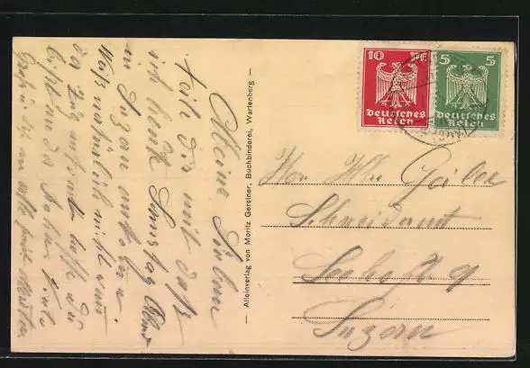 Personenbezogene Daten auf der Rückseite der Karte wurden durch blauen Textmarker unkenntlich gemacht. Die blauen Stellen sind auf die Vorderseite durchgeweicht und wirken sich negativ auf das Postkartenfoto aus