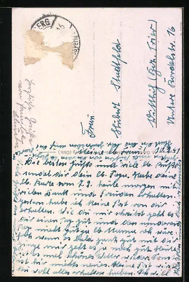 Personenbezogene Daten auf der Rückseite der Karte wurden durch blauen Textmarker unkenntlich gemacht. Die blauen Stellen sind auf die Vorderseite durchgeweicht und wirken sich negativ auf das Postkartenfoto aus
