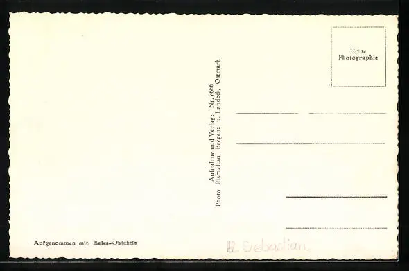 Personenbezogene Daten auf der Rückseite der Karte wurden durch blauen Textmarker unkenntlich gemacht. Die blauen Stellen sind auf die Vorderseite durchgeweicht und wirken sich negativ auf das Postkartenfoto aus
