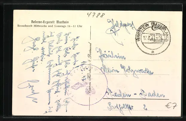 Personenbezogene Daten auf der Rückseite der Karte wurden durch blauen Textmarker unkenntlich gemacht. Die blauen Stellen sind auf die Vorderseite durchgeweicht und wirken sich negativ auf das Postkartenfoto aus