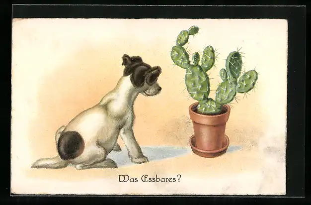 AK Was Essbares?, Terrier sitzt vor einem Kaktus