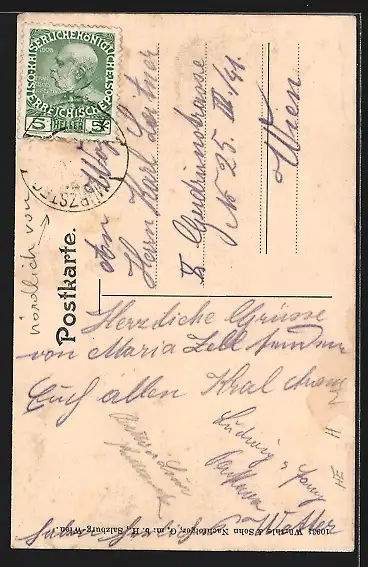 Personenbezogene Daten auf der Rückseite der Karte wurden durch blauen Textmarker unkenntlich gemacht. Die blauen Stellen sind auf die Vorderseite durchgeweicht und wirken sich negativ auf das Postkartenfoto aus