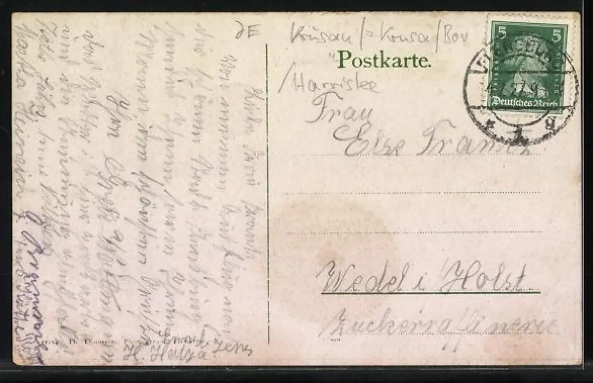 Personenbezogene Daten auf der Rückseite der Karte wurden durch blauen Textmarker unkenntlich gemacht. Die blauen Stellen sind auf die Vorderseite durchgeweicht und wirken sich negativ auf das Postkartenfoto aus