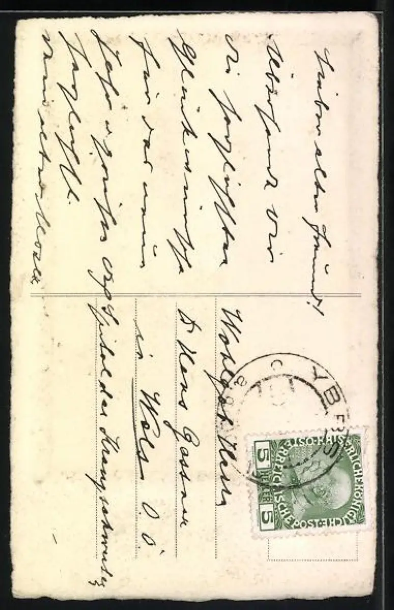 Personenbezogene Daten auf der Rückseite der Karte wurden durch blauen Textmarker unkenntlich gemacht. Die blauen Stellen sind auf die Vorderseite durchgeweicht und wirken sich negativ auf das Postkartenfoto aus