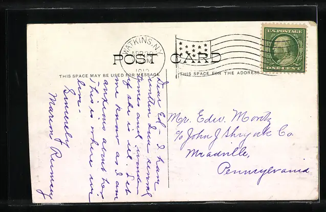 Personenbezogene Daten auf der Rückseite der Karte wurden durch blauen Textmarker unkenntlich gemacht. Die blauen Stellen sind auf die Vorderseite durchgeweicht und wirken sich negativ auf das Postkartenfoto aus