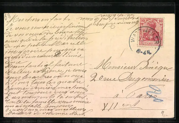 Personenbezogene Daten auf der Rückseite der Karte wurden durch blauen Textmarker unkenntlich gemacht. Die blauen Stellen sind auf die Vorderseite durchgeweicht und wirken sich negativ auf das Postkartenfoto aus