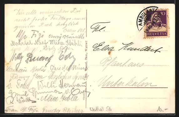 Personenbezogene Daten auf der Rückseite der Karte wurden durch blauen Textmarker unkenntlich gemacht. Die blauen Stellen sind auf die Vorderseite durchgeweicht und wirken sich negativ auf das Postkartenfoto aus