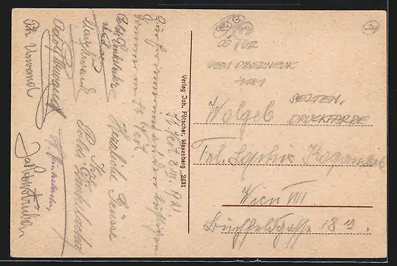 Personenbezogene Daten auf der Rückseite der Karte wurden durch blauen Textmarker unkenntlich gemacht. Die blauen Stellen sind auf die Vorderseite durchgeweicht und wirken sich negativ auf das Postkartenfoto aus