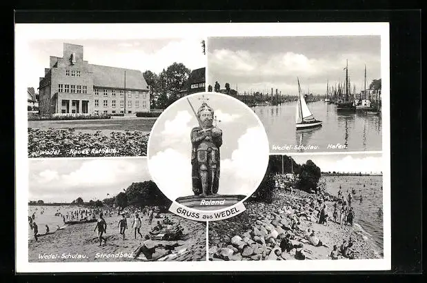 AK Wedel, Neues Rathaus, Hafen, Strandbad und Roland