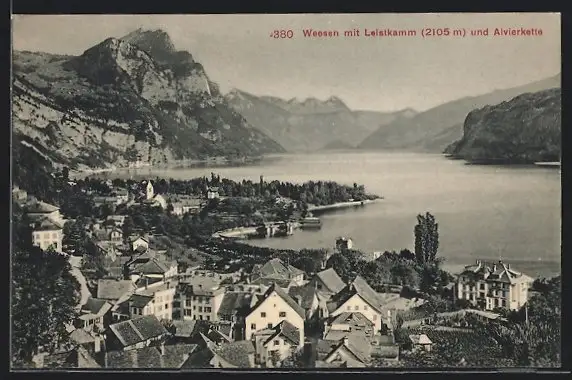 AK Weesen, Ortspanorama mit Leistkamm und Alvierkette