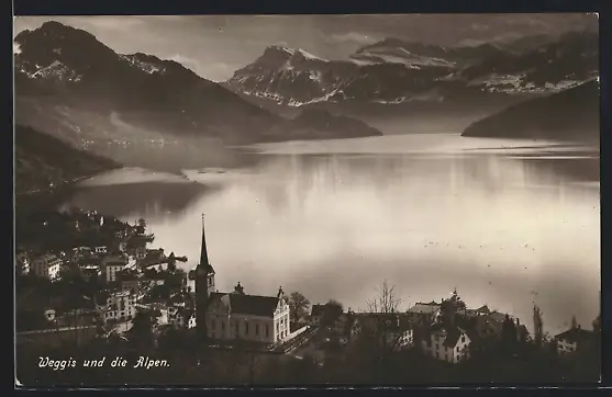AK Weggis, Ortsansicht gegen Bergsee und die Alpen