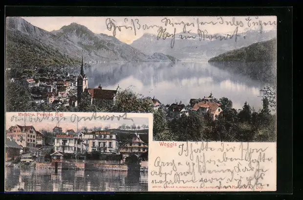 AK Weggis, Ortsansicht mit Hotel u. Pension Rigi