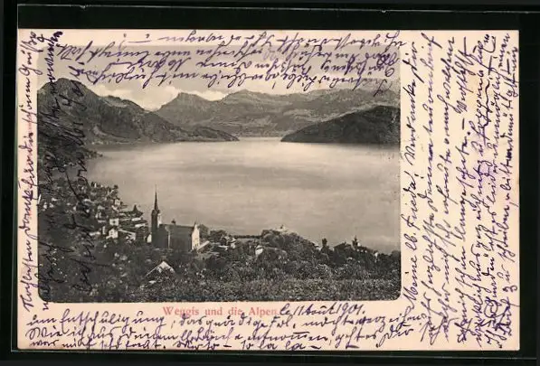 AK Weggis, Totalansicht und die Alpen