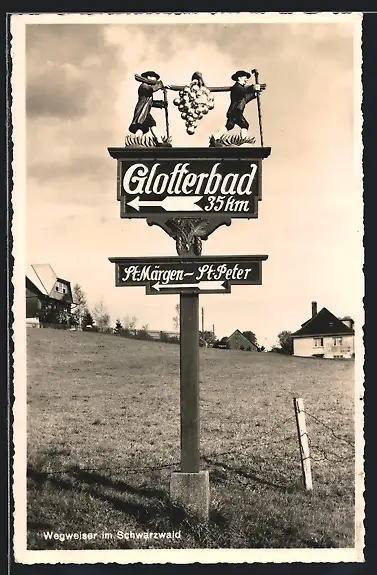 AK Wegweiser nach Glotterbad, Männerfiguren tragen Trauben