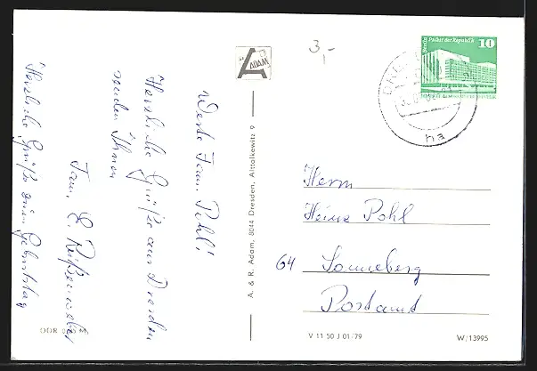 Personenbezogene Daten auf der Rückseite der Karte wurden durch blauen Textmarker unkenntlich gemacht. Die blauen Stellen sind auf die Vorderseite durchgeweicht und wirken sich negativ auf das Postkartenfoto aus