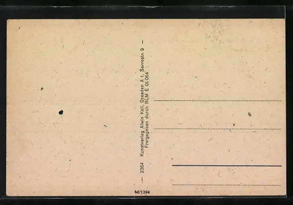 Personenbezogene Daten auf der Rückseite der Karte wurden durch blauen Textmarker unkenntlich gemacht. Die blauen Stellen sind auf die Vorderseite durchgeweicht und wirken sich negativ auf das Postkartenfoto aus