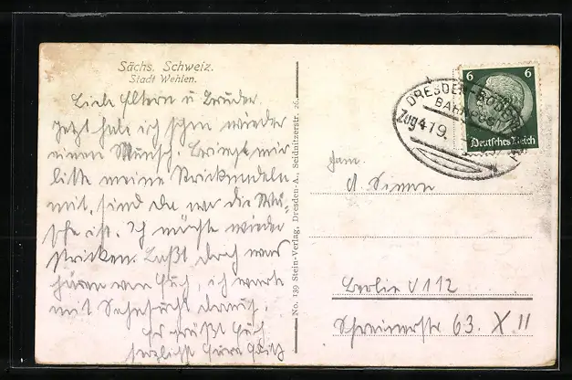 Personenbezogene Daten auf der Rückseite der Karte wurden durch blauen Textmarker unkenntlich gemacht. Die blauen Stellen sind auf die Vorderseite durchgeweicht und wirken sich negativ auf das Postkartenfoto aus