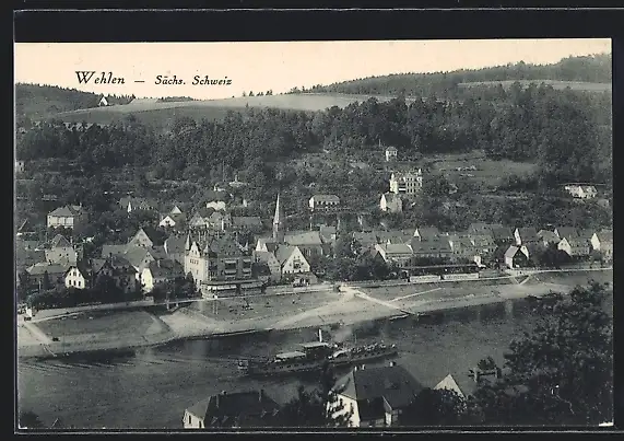 AK Wehlen /Sächs. Schweiz, Ortsansicht mit Dampfer aus der Vogelschau
