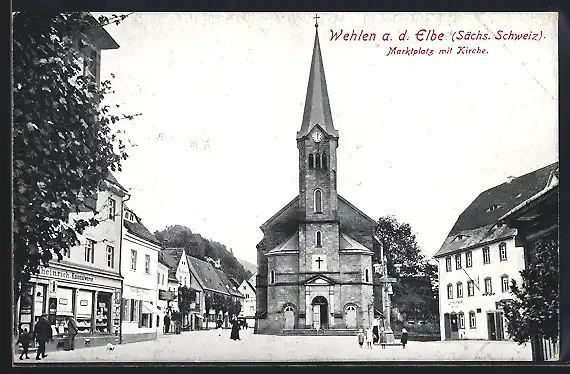 AK Wehlen a. d. Elbe, Marktplatz mit Kirche