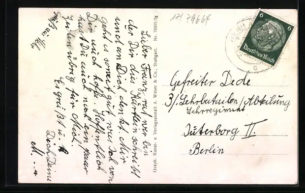 Personenbezogene Daten auf der Rückseite der Karte wurden durch blauen Textmarker unkenntlich gemacht. Die blauen Stellen sind auf die Vorderseite durchgeweicht und wirken sich negativ auf das Postkartenfoto aus