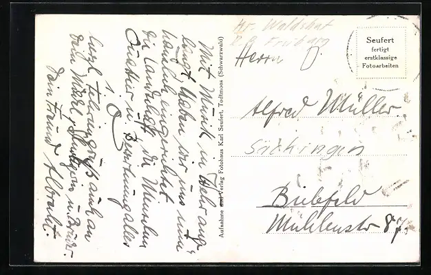 Personenbezogene Daten auf der Rückseite der Karte wurden durch blauen Textmarker unkenntlich gemacht. Die blauen Stellen sind auf die Vorderseite durchgeweicht und wirken sich negativ auf das Postkartenfoto aus
