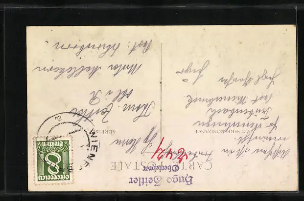 Personenbezogene Daten auf der Rückseite der Karte wurden durch blauen Textmarker unkenntlich gemacht. Die blauen Stellen sind auf die Vorderseite durchgeweicht und wirken sich negativ auf das Postkartenfoto aus