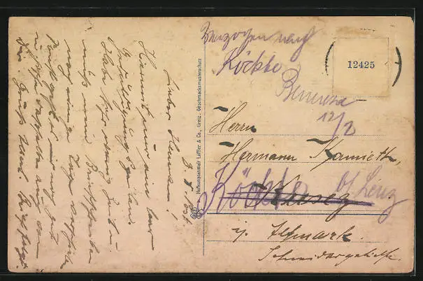 Personenbezogene Daten auf der Rückseite der Karte wurden durch blauen Textmarker unkenntlich gemacht. Die blauen Stellen sind auf die Vorderseite durchgeweicht und wirken sich negativ auf das Postkartenfoto aus