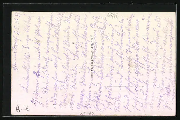 Personenbezogene Daten auf der Rückseite der Karte wurden durch blauen Textmarker unkenntlich gemacht. Die blauen Stellen sind auf die Vorderseite durchgeweicht und wirken sich negativ auf das Postkartenfoto aus