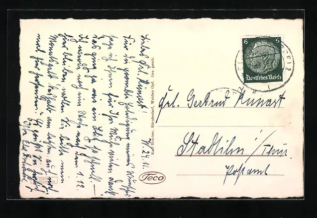 Personenbezogene Daten auf der Rückseite der Karte wurden durch blauen Textmarker unkenntlich gemacht. Die blauen Stellen sind auf die Vorderseite durchgeweicht und wirken sich negativ auf das Postkartenfoto aus