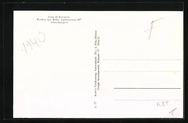 Personenbezogene Daten auf der Rückseite der Karte wurden durch blauen Textmarker unkenntlich gemacht. Die blauen Stellen sind auf die Vorderseite durchgeweicht und wirken sich negativ auf das Postkartenfoto aus