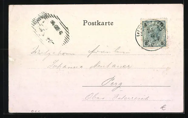 Personenbezogene Daten auf der Rückseite der Karte wurden durch blauen Textmarker unkenntlich gemacht. Die blauen Stellen sind auf die Vorderseite durchgeweicht und wirken sich negativ auf das Postkartenfoto aus