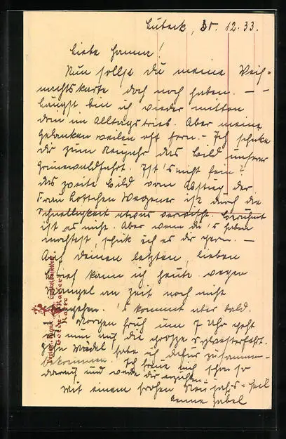 Personenbezogene Daten auf der Rückseite der Karte wurden durch blauen Textmarker unkenntlich gemacht. Die blauen Stellen sind auf die Vorderseite durchgeweicht und wirken sich negativ auf das Postkartenfoto aus