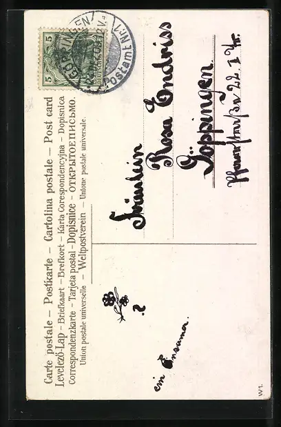 Personenbezogene Daten auf der Rückseite der Karte wurden durch blauen Textmarker unkenntlich gemacht. Die blauen Stellen sind auf die Vorderseite durchgeweicht und wirken sich negativ auf das Postkartenfoto aus