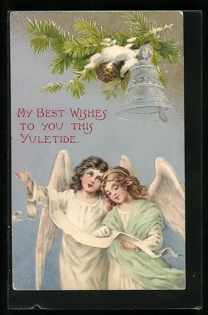 AK Weihnachtsengel mit silberner Glocke und verschneitem Zweig