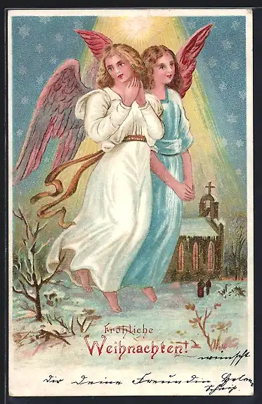 AK Weihnachtsengel schweben über verschneiter Kirche