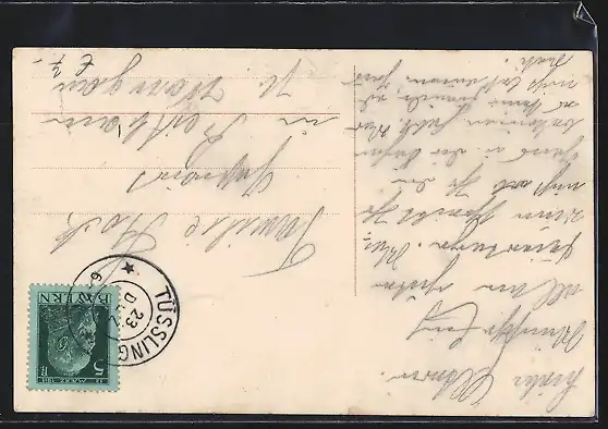 Personenbezogene Daten auf der Rückseite der Karte wurden durch blauen Textmarker unkenntlich gemacht. Die blauen Stellen sind auf die Vorderseite durchgeweicht und wirken sich negativ auf das Postkartenfoto aus