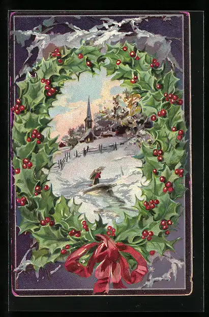 AK Weihnachtsgruss, Winterlandschaft im Stechpalmen-Kranz