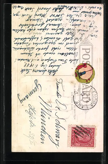 Personenbezogene Daten auf der Rückseite der Karte wurden durch blauen Textmarker unkenntlich gemacht. Die blauen Stellen sind auf die Vorderseite durchgeweicht und wirken sich negativ auf das Postkartenfoto aus