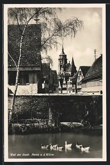 AK Weil der Stadt, Partie a. d. Würm, Blick zur Kirche