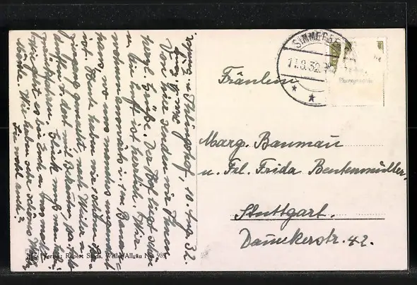 gelaufen 1932, Briefmarke entfernt, rückseitig Klebe- und Papierreste, guter Zustand