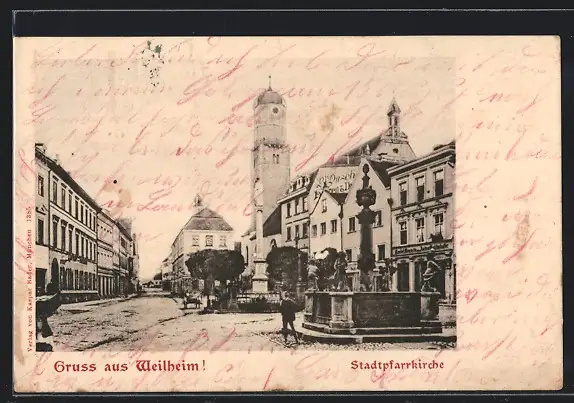 AK Weilheim, Brunnen vor der Stadtpfarrkirche
